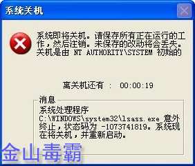 如果您的机器看到以下界面及提示文字,机器运行缓慢、网络堵塞、并让系统不停的进行倒计时重启,表明用户已中“震荡波”病毒。