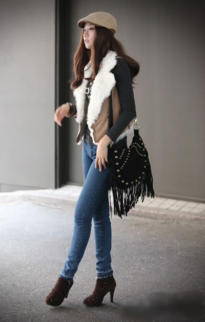 穿衣搭配一定要注意张弛有度,上装宽松,下面就要相对瘦削,切不可一身宽松或一身紧绷。下面我们看到的漂亮韩国美眉就深知其中之道,用上身体积感的叠搭与下身的skinny裤形成对比反衬,一下子显得非常高挑——
