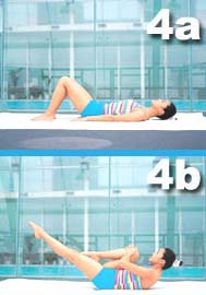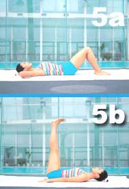 5b.腹肌用力,抬举双腿,膝关节绷直,双腿和身体呈90度角。维持5秒,然后慢慢放下。共做3组,每组15次。