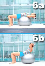 6a.上身平躺于健身球上,膝盖弯曲和大腿呈90度角,双手平放于耳后,保持平衡。