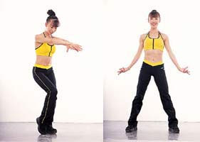 1.低头,右手扶耳,左手叉腰,左腿弯曲脚尖点地