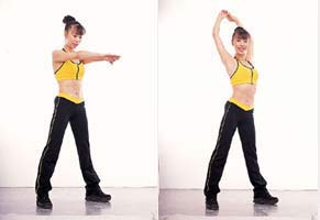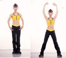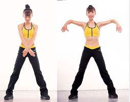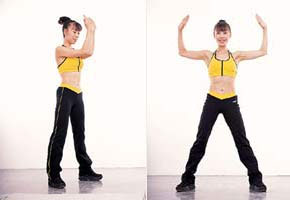 2.手臂抬起,向头后方用力,尽量展胸,同时分腿