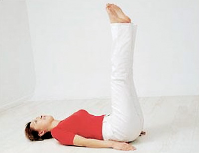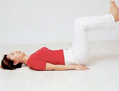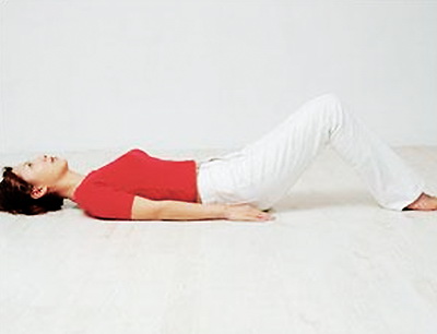 面朝上身体放松躺在地板上,膝盖微微弯曲抬起。这时,腹部处于松弛状态,脊椎骨则处于垂直拉伸的状态。