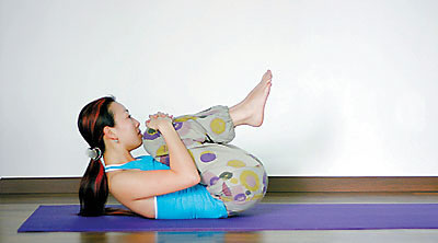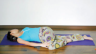 Tips:尽量使两膝靠近床面,结束动作后,伸直两腿,抖动放松。