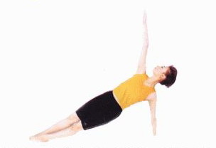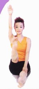 2、坐在地上,双腿向前伸直,并拢。脚跟着地,两手撑床。用左臂支撑,将全身重量压在左手上,右臂上举。然后右臂尊下,身体向右压,体重落在右手上,左臂上举。