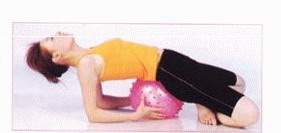 3、盘腿坐在地上,双臂在身后抱一皮球手与臀部同高,提起臀部压皮球做5次。