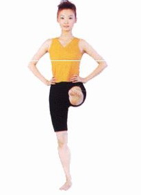 8、直立,两手叉腰,先将左腿绷直,尽量往上,停2-3秒钟再放下,再换右腿做。如此交替,重复10-20次。