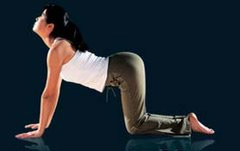 动作:跪于地板,双手支撑身体。吸气,脊柱向下伸展,抬头,引颈向上,同时臀部向上翘。呼气,含胸,拱背,垂头引颈向下,腹部肌肉收紧,使整个背部尽量向上搭起。