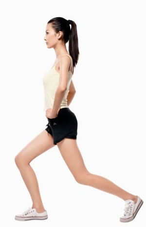 站姿,双手叉腰,提右腿,向前跨一大步,同时左腿向地面屈膝,直至膝盖离地面15厘米左右,保持3秒钟。然后换腿进行。重复该动作10次。