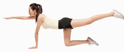 双手、双膝贴地,采取匍匐姿势,用力向后抬起右腿,与地面保持平衡,与此同时,向前伸直左手臂,也与地面保持平行。保持该姿势5秒钟。然后换腿进行。重复10次。