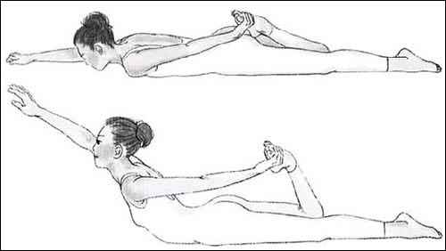 1. 俯卧。右手向前伸展,并用左手抓住右脚。