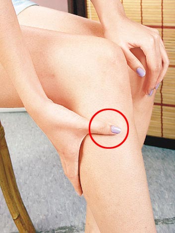 「足三里穴」(红圈位置)在膝盖顶对下距离4只手指位。