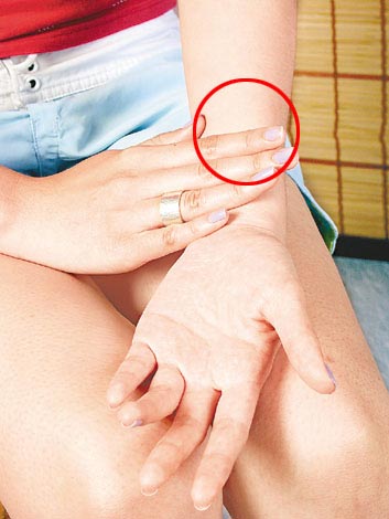 「间使穴」(红圈位置)在手腕内侧,腕前对下距离4只手指位。