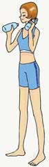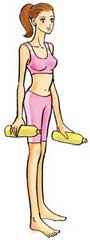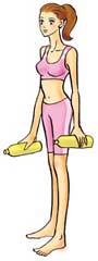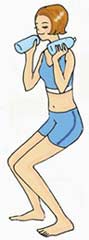 步骤三:以半蹲姿势维持数秒静止不动,再一面吐气、一面恢复原来的站立姿势。两手各拿一个饮水瓶,两手臂下垂在身体两边,两腿并拢、伸直背脊站立。