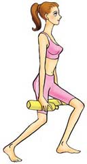 注意:此动作对紧缩大腿内侧肌肉很有效果,其重点在于身体重心的移动;当上身倾向于往前跨出的那一脚时,要将重心移至前面。注意跨出步伐勿过大,如果步伐太大,恢复原来姿势时容易失去平衡。