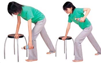 有意识地提膝,拿着瓶子,手臂做上下运动,使背部肌肉向上拉伸,同时扩展胸部。此运动可分3组,左右各10次。