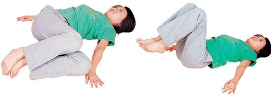 双肩紧贴在地板上,双膝并拢,倒向一侧,尽量贴近地板,同时深吸一口气。(会有些许疼痛感) 学习呼吸法 提臀瘦膝缩腹 呼气时将双膝转回到身体正面,再一边吸气一边向反侧倾斜。将此动作连续做3组,每组10次为宜。