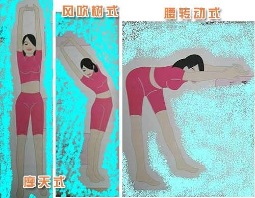 两脚分开,手指交叉翻掌,两臂上举吸气,呼气时身体前屈90度,两眼注视手,吸气时身体向右方,呼气时转向左方。共6组,回到中间还原。