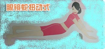俯卧,手掌放置胸两侧,缓慢支起上半身,脚尖蹬地,头缓慢扭向右侧,眼睛尽量去看左脚,保持数秒,转向另一侧相同,共6组,回到中间还原。(注意:撑起上半身,腰背疼,可以把手往身体前方放一点)