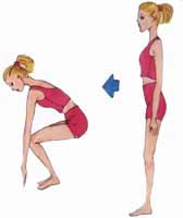 以立正的姿势站着、两手放在身体两侧。弯曲膝盖,两手碰触脚趾(此时,不要太用力)。诀窍在于,不弯曲背部肌肉,只弯曲膝盖。再轻轻回到原来的姿势。这个动作大约为3秒,刚开始做的时候,以1O秒钟做3次为目标,习惯后再加速吧。
