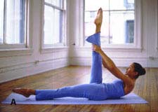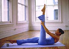 A、面朝上躺在垫子上,收紧腹部,竖直抬起右腿,左腿离开地面1英寸,两条腿呈90度角,绷紧脚尖。弯曲后背和肩膀,用双手抓住右腿的小腿部分。保持15到30秒钟,肘部一直是抬起的,肩膀要远离耳朵,腹部收紧。