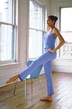 、右手放在椅背上,左手放在腰间。尽可能抬高左腿,但要保持整条腿是一条直线。左脚绷紧脚尖,同时稍微旋转右腿,右脚脚趾朝身体外侧。
