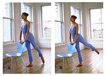 A、右手放在椅背上,左手放在腰间。尽可能抬高左腿,但要保持整条腿是一条直线。左脚绷紧脚尖,同时稍微旋转右腿,右脚脚趾朝身体外侧。