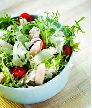 3.将切好的材料放入沙拉碗,最后加上卷毛生菜。依照自己口味,滴入柠檬汁和橄榄油,再放些许盐和黑胡椒。