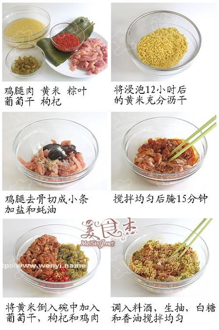 原料:鸡腿2个、 黄米200克、 葡萄干30克、枸杞20克、粽叶40张(1袋)
