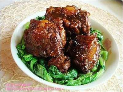 7、少量鸡精调味,大火收汁,将牛尾盛于炒好的小白菜上,淋上汤汁即可。