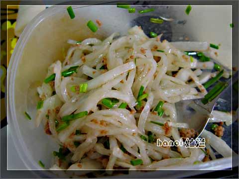 拌入糖少许,葱花,鸡精,可以加点虾米和香菇之类的DD,偶没有准备那么多,就加了点炒香的肉末,少许香油。拌匀。