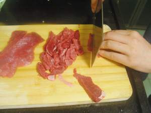 材料:牛里脊肉(200克)、指天椒(10只)、姜(3片)、葱(2根)