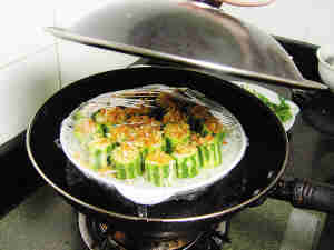材料:丝瓜(2根,500克)、粉丝(50克)、虾米(50克)、蒜蓉(2汤匙)、葱花(1汤匙)、清鸡汤(1/3杯)