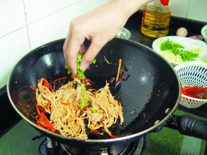 6 烧热2汤匙油,炒香葱姜丝、红椒丝和干辣椒圈,倒入炸好的藕丝炒匀。