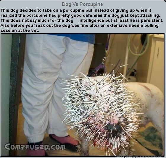 厄。。。听起来好象是人类在做实验看看此狗能非打赢豪猪咯??。。看起来很惨。。可怜的。。