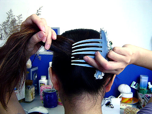 2.用齿梳向下微微扯皮筋,然后把头发忘右边放,齿梳从马尾下面慢慢往左边来,逐渐向上翻